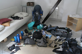 Matos :2 sacs à dos (60L et 70L), 1 porte bébé, 3 duvets, 1 sac photo, 2 gourdes, 4 serviettes randonnée, téléphone portable débloqué, siflet plastique, cadenas à code, épingles à nourrice, 2 couteaux multifonctions, 2 frontales + 1 mag-lite+piles, porte billets, mousquetons, jouet pour la louloute, pancho pluie, carnets de route, cartes routière, 2 appareils photos numériques, camescope, lecteur de carte mémooire, et petite paire de jumelles.