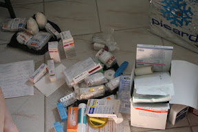 -de Santé : collyres, comprimés de purification d'eau, insecte écran peau et vêtements, pillule contraceptive pour 12 mois, écran total, antidiarrhétique, sel de réhydratation, seringue, aspivenin, antibiotique, aspirine, doliprane, compresse, pansements, désinfectant, anti histaminique, diurétique (pour la montagne), laxatif, crème apaisante contre les piqûres et un thermomètre.